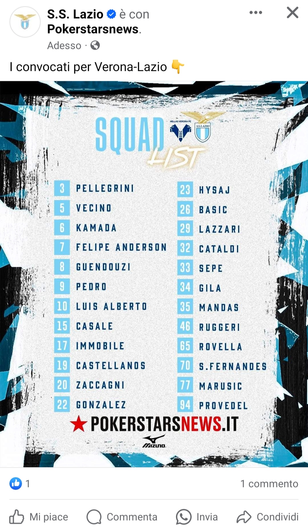 Da sottolineare anche il recupero di Zaccagni, Luis Alberto e Casale abili e arruolabili. Assenti Patric e Romagnoli ancora out per infortunio.